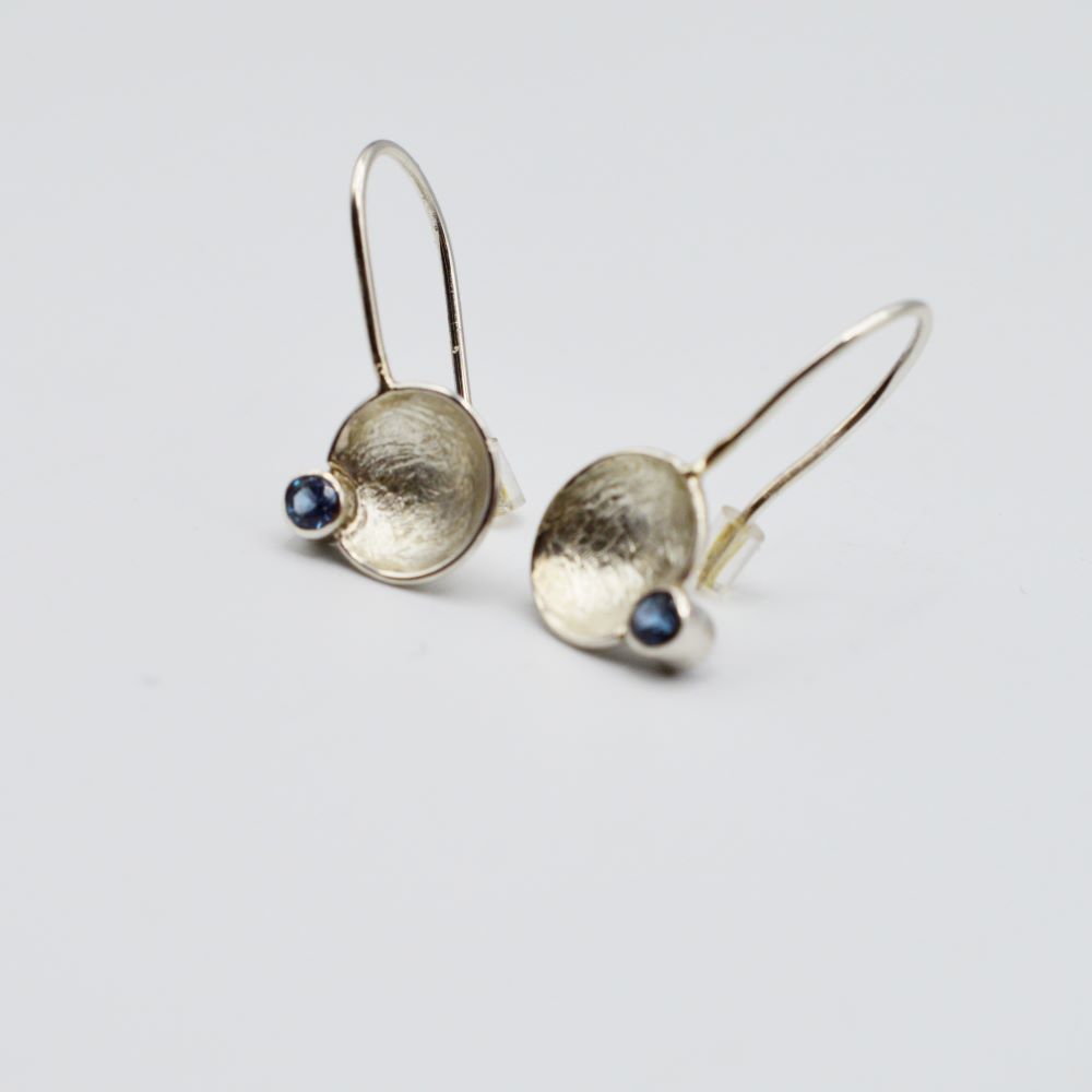 Handgemaakte zilveren oorbellen met aquamarijn steentjes. De oorbellen bestaan uit twee rondjes die hol geslagen zijn. In deze rondjes zijn aan de zijkant heel subtiel, mooie3 aquamarijn steentje verwerkt. Deze hebben een mooie licht blauwe kleur. De oorbellen zijn voorzien van een fijne structuur en zijn mat afgewerkt. Dit geeft samen met de steentjes een erg mooi effect. De oorbellen worden geleverd met kleine kunststof stoppertjes. Een prachtig sieraad voor de oren. Leuk om cadeau te geven of om te krijgen.