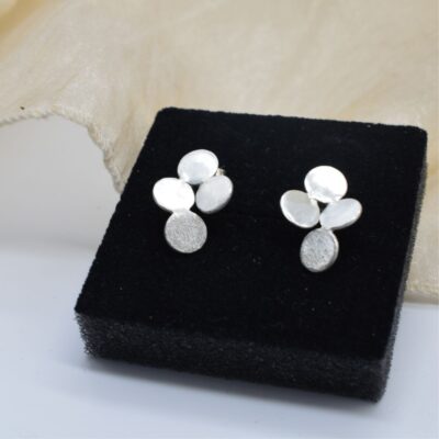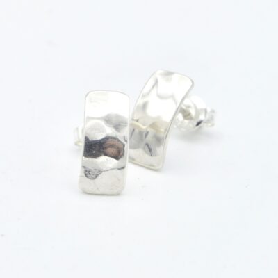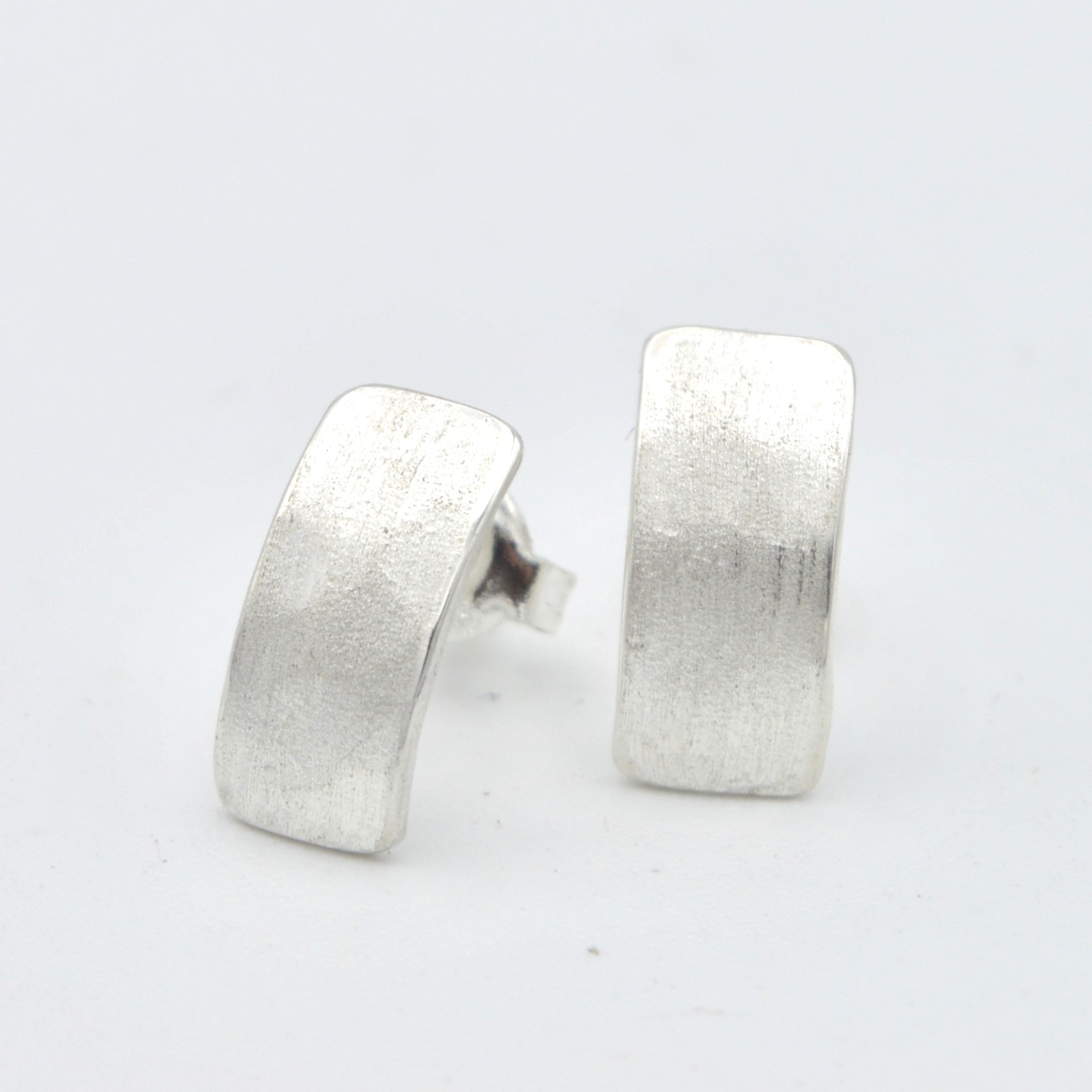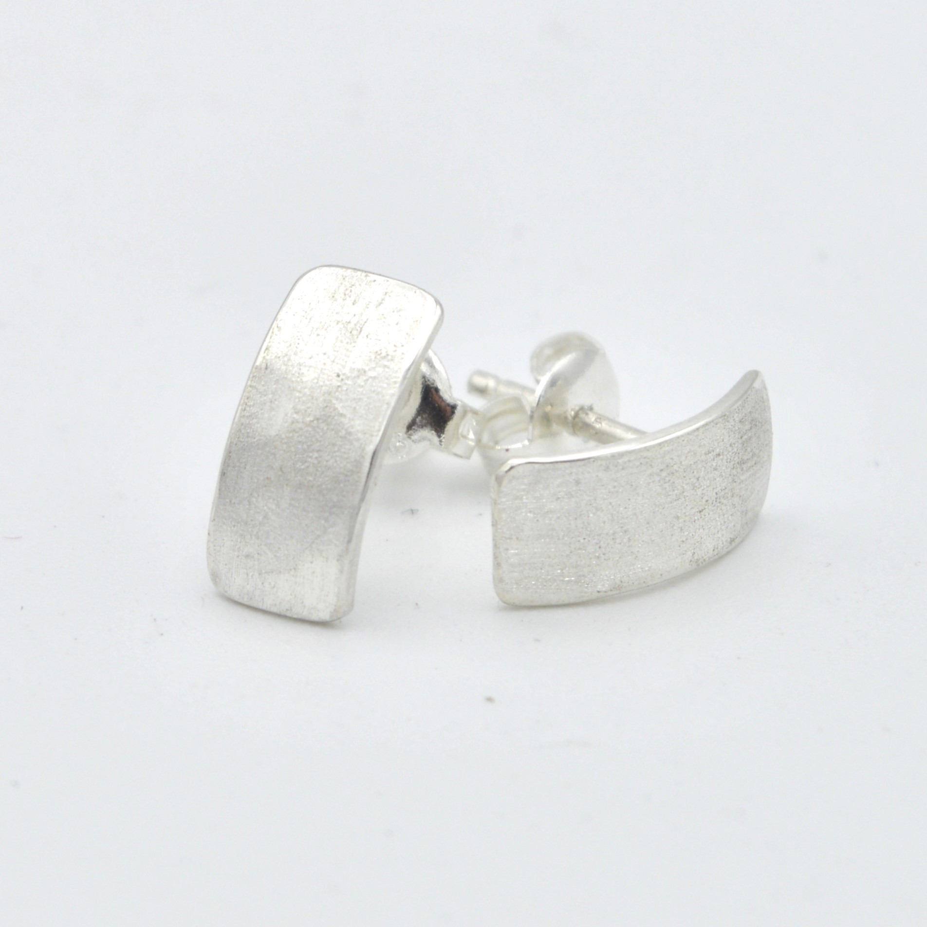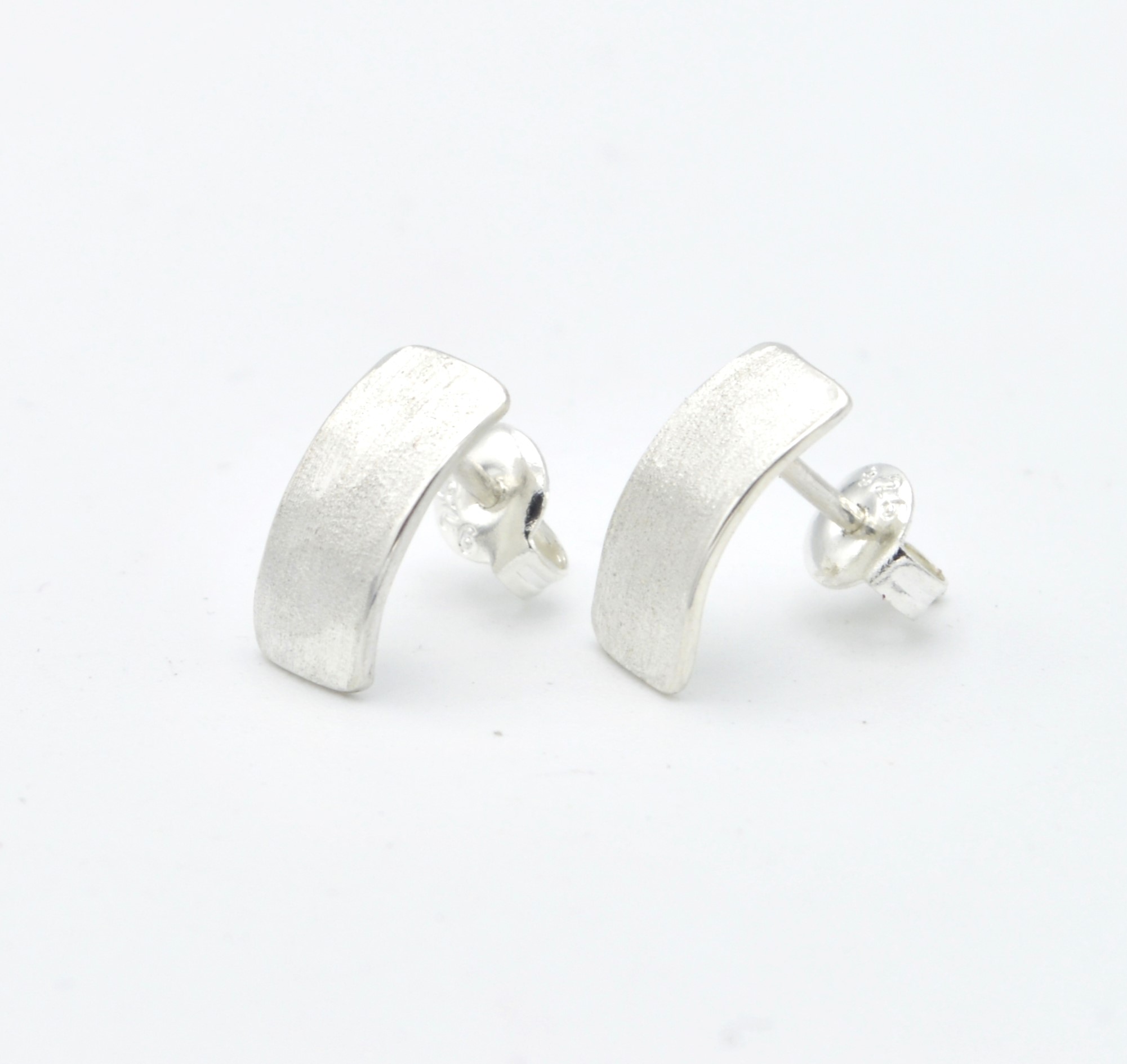 Handgemaakte zilveren oorbellen met stekertjes. De langwerpige zijn voorzien van een hele fijne structuur en mat afgewerkt. De gehele oorbel is iets bol geslagen, waardoor kleine boogjes ontstaan.