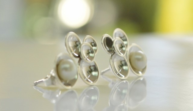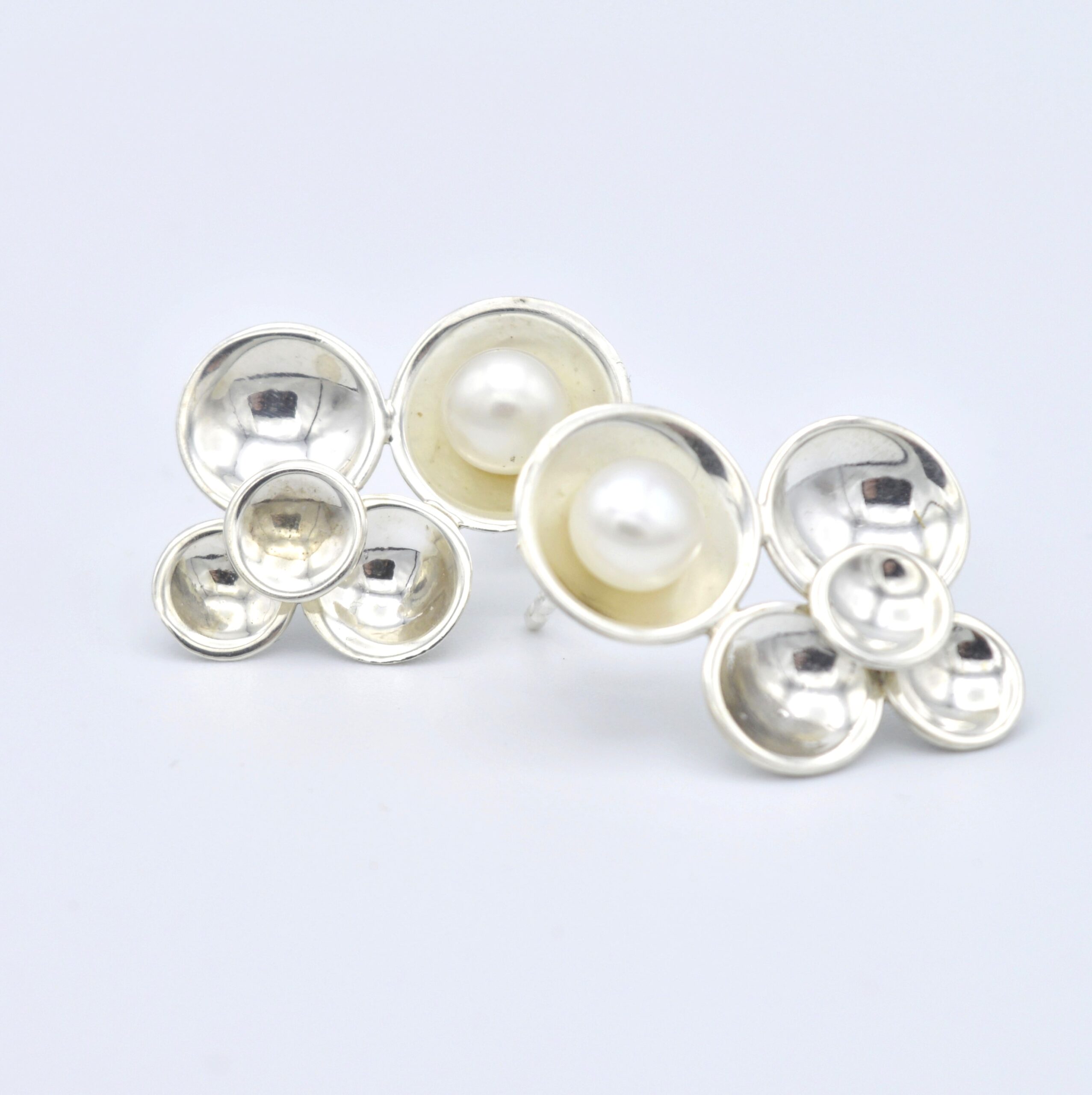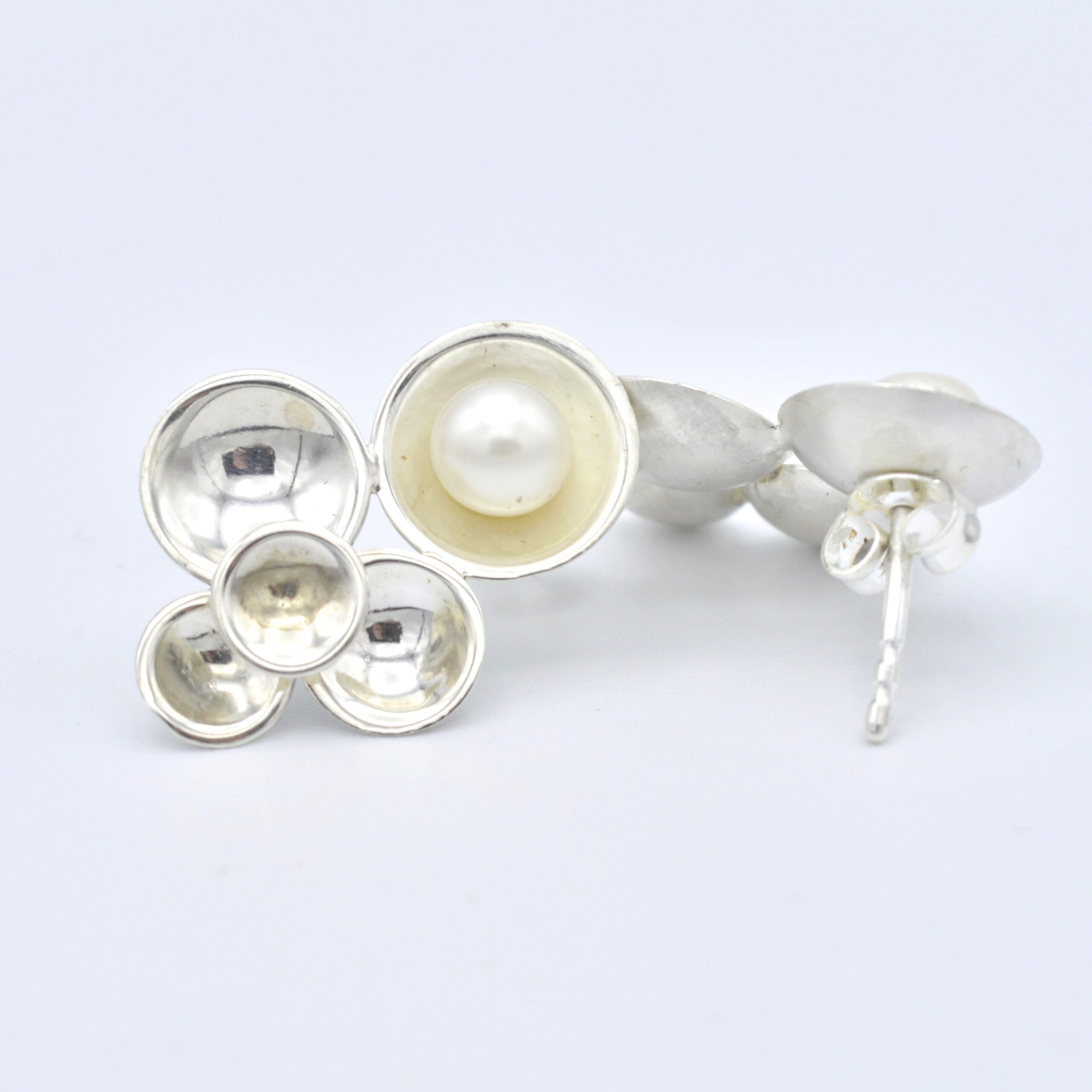 Handgemaakt zilveren oorbellen met witte zoetwaterparel. Vijf hol geslagen rondjes van verschillende groottes naast en op elkaar. De grootste is voorzien van een witte zoetwater parel. Voorzien van stekertjes en in hoogglans afgewerkt.