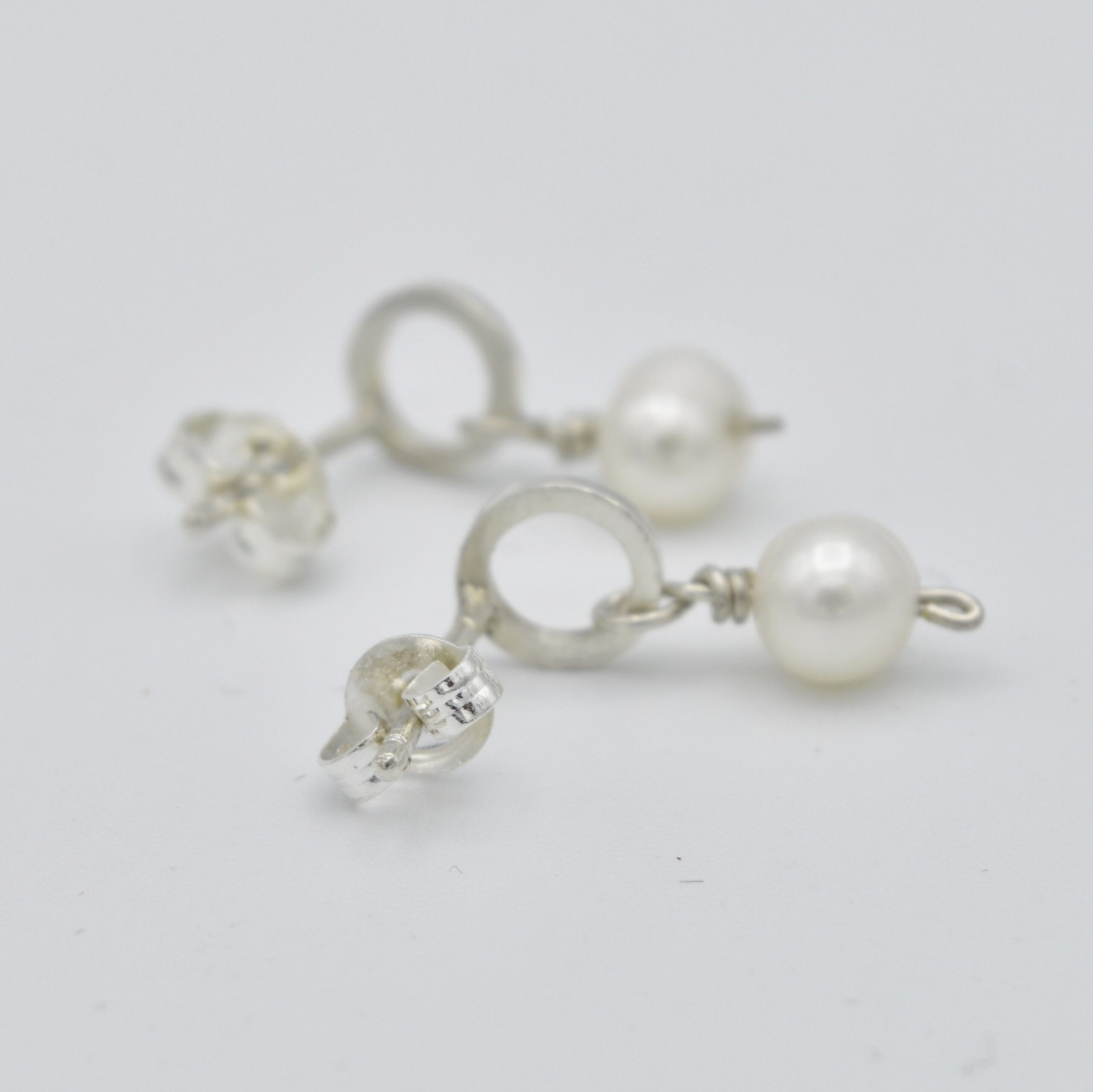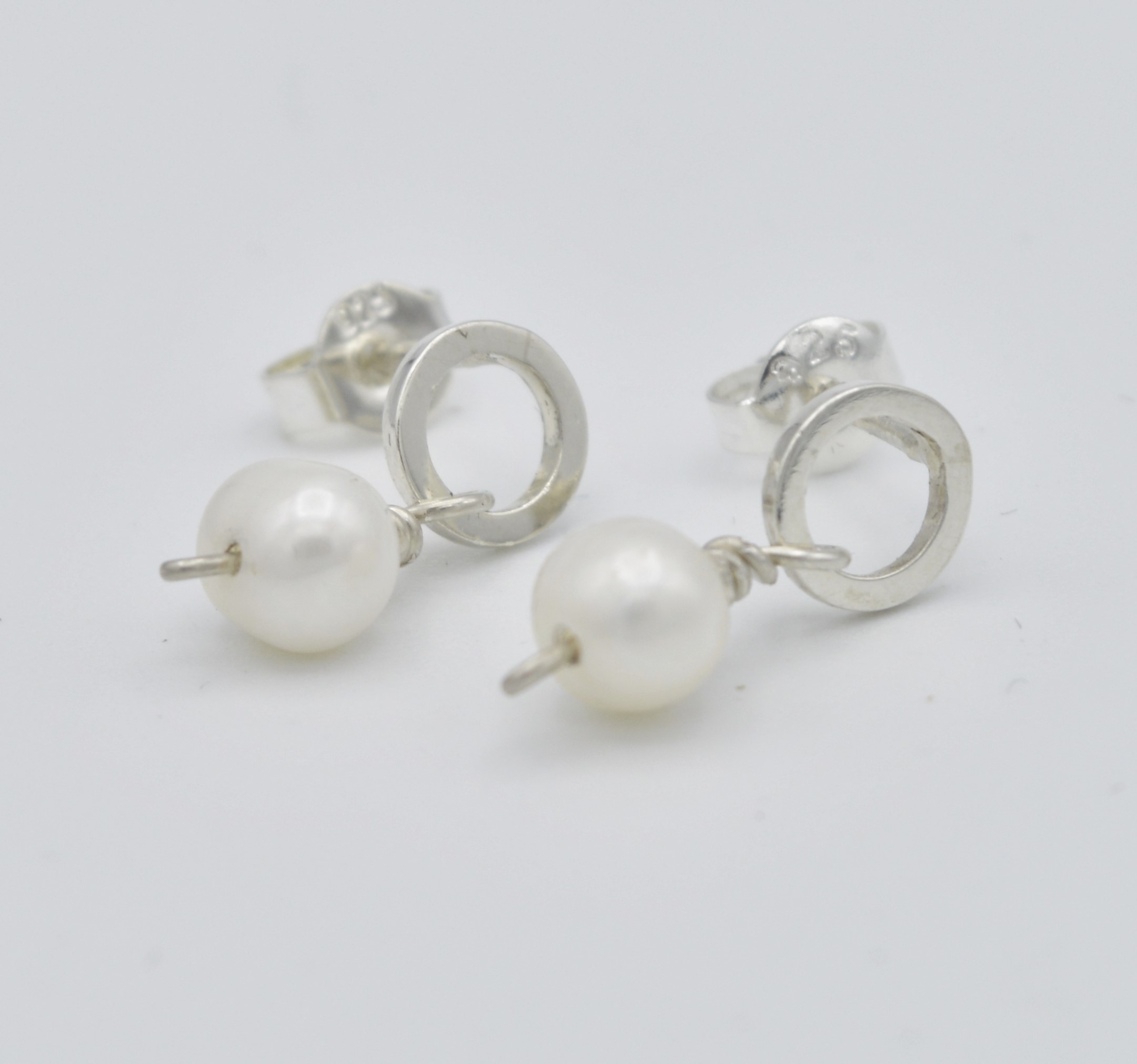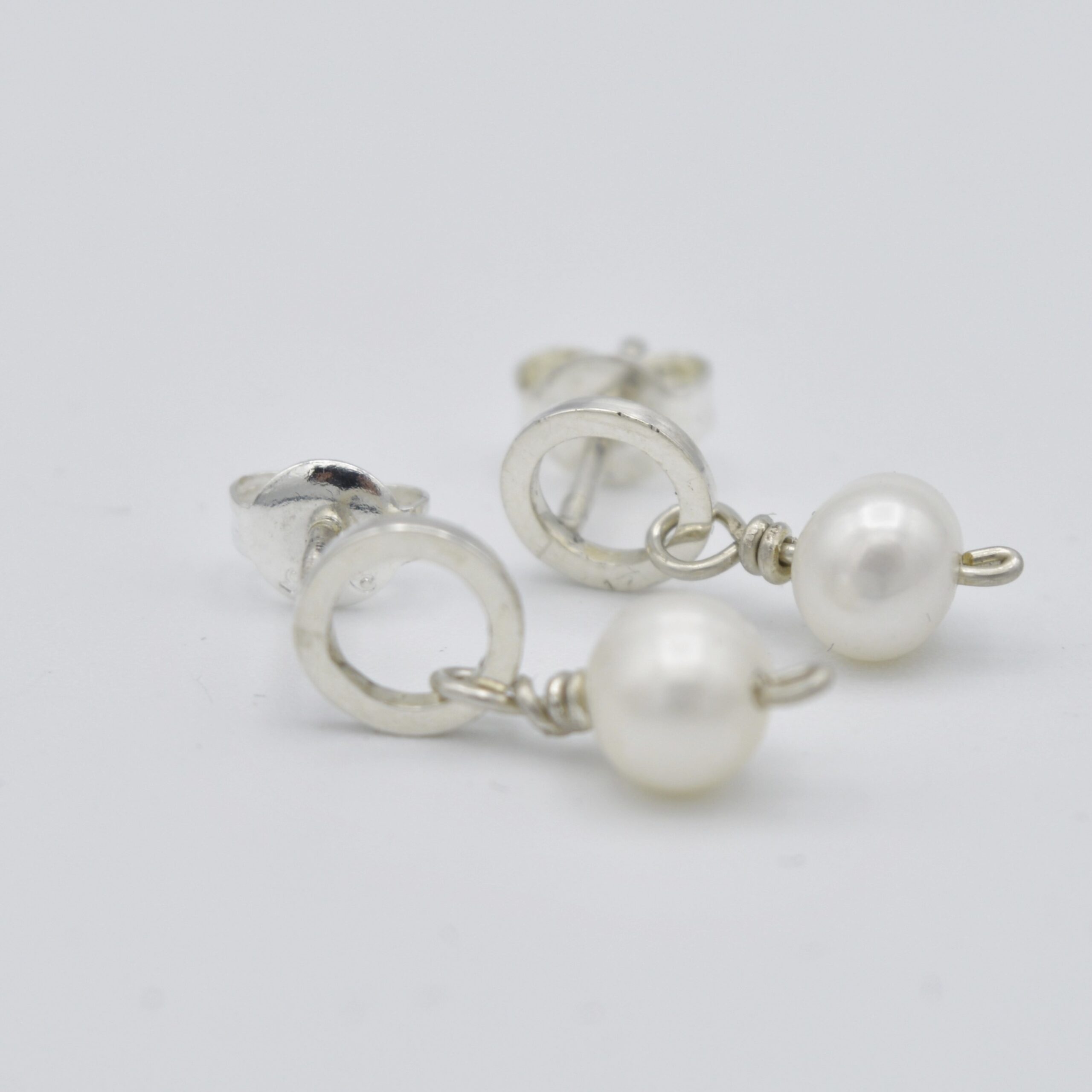 Handgemaakte zilveren oorbellen met stekertjes. De oorbellen zijn strakke open rondjes van vierkant draad, waaraan witte zoetwater pareltjes zijn bevestigd. Samen vormt dit een mooi sieraad voor de oren. De oorbellen zijn in hoogglans afgewerkt.